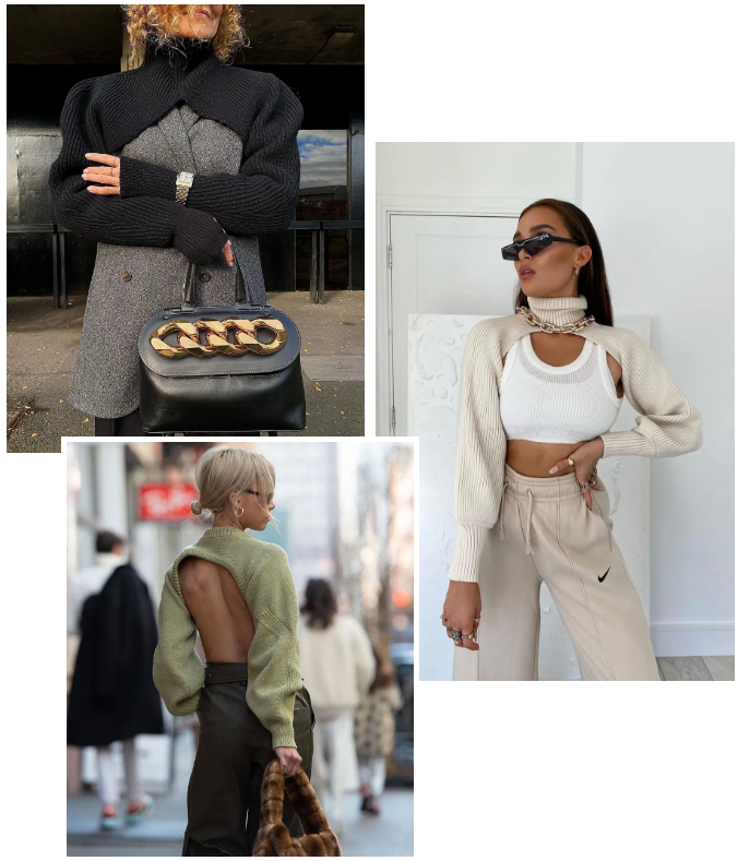 款式上呢,还记得刷屏了一整季的极短“袖套毛衣”吗?也不知道该把它当成带高领的围巾呢,还是冬天躺床上刷手机时用来保护老寒肩。反正火了很久~~