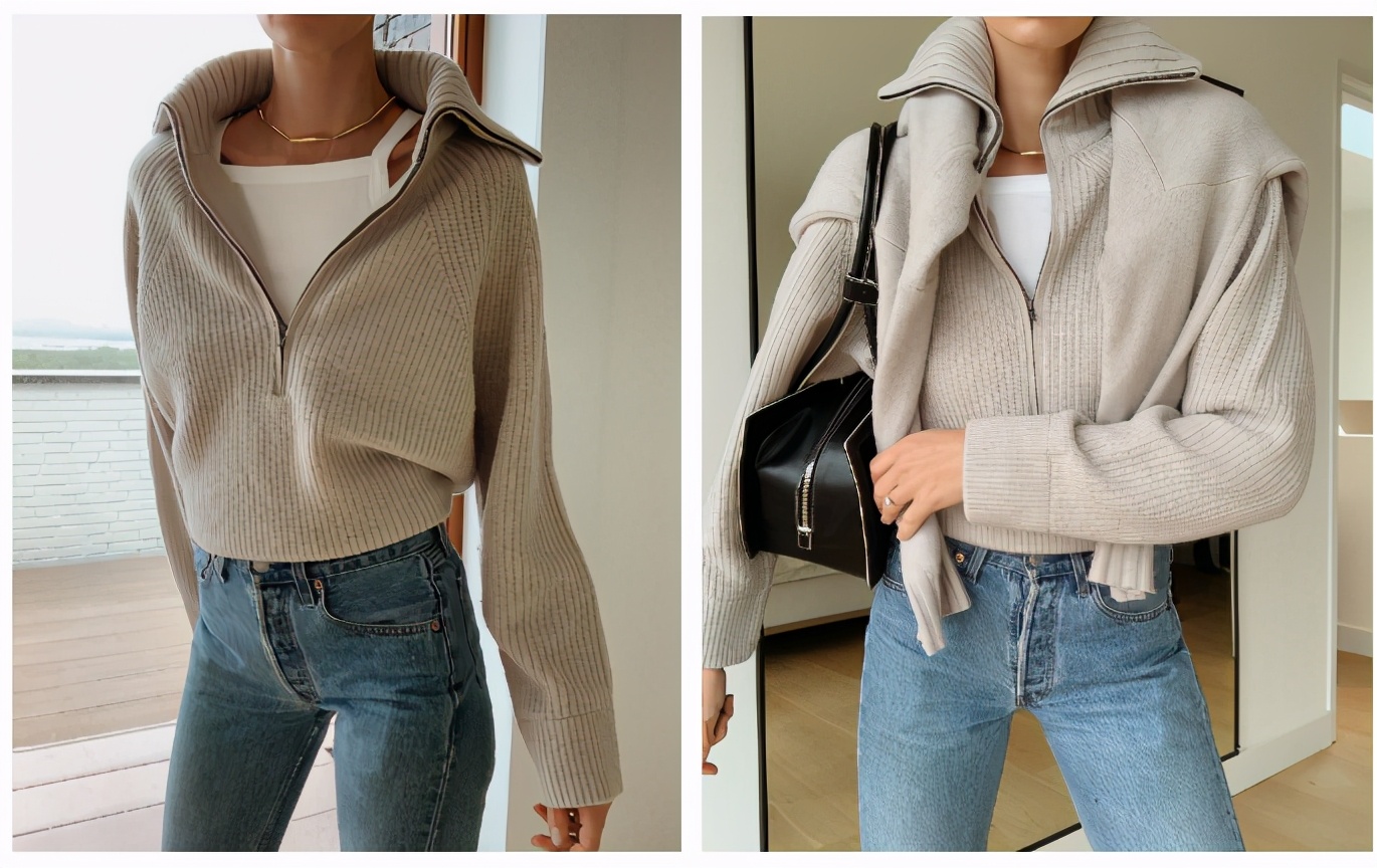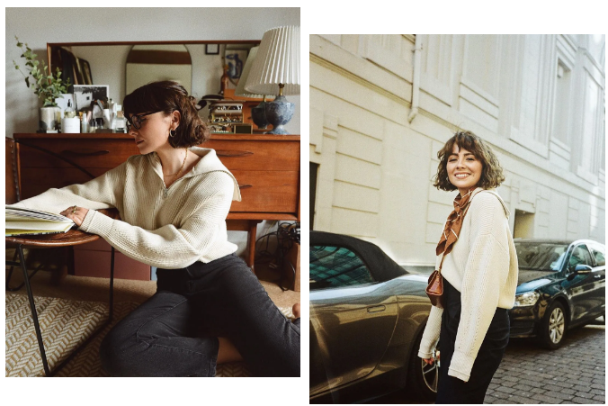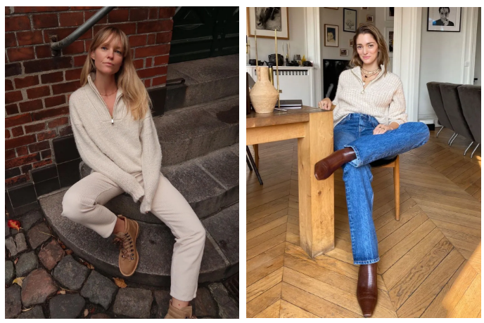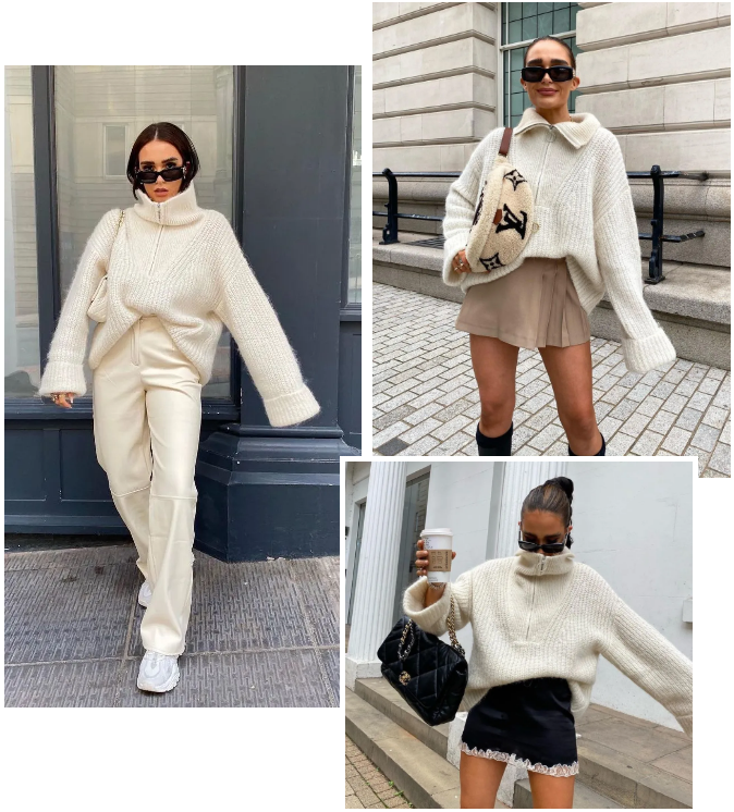 这么多拉链毛衣中,我最爱的还是荷兰博主Anouk Yve穿的这件ZENGGI。它是那种有点小廓形,但又不会特别夸张的设计,单穿或者做内搭都好看。