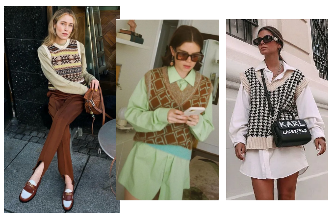 除此之外,提花马甲也蛮值得拥有的。像复古的费尔岛图案、菱形格,或百搭的千鸟格…都不错,冬天配外套很合适。