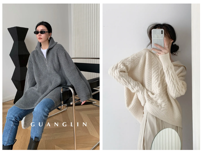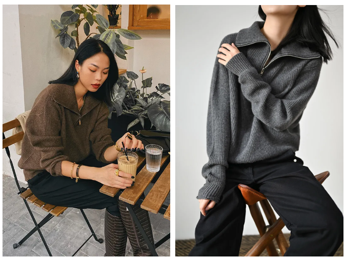 总得来说,拉链翻领毛衣会比前面介绍的两类更帅气些,适合休闲风格的女生。而且它也很实穿,拉链拉开和拉上可以适配不同的温度和搭配。