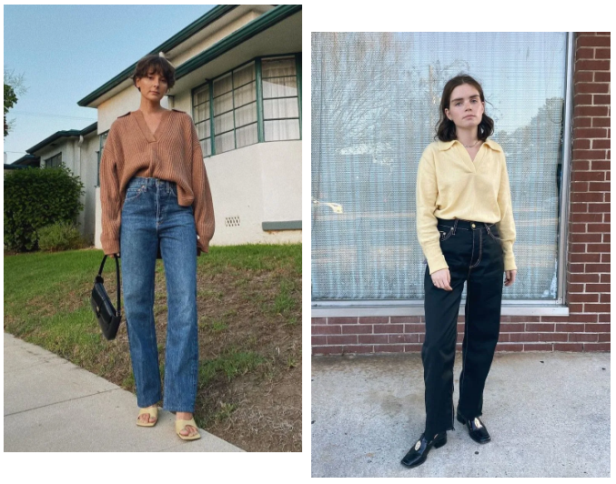 剪了短发的Alyssa穿了件宽松驼色的oversize,怪怪博主Reese pick了一件嫩到出水的小鸡黄,两人都搭配了直筒牛仔裤。