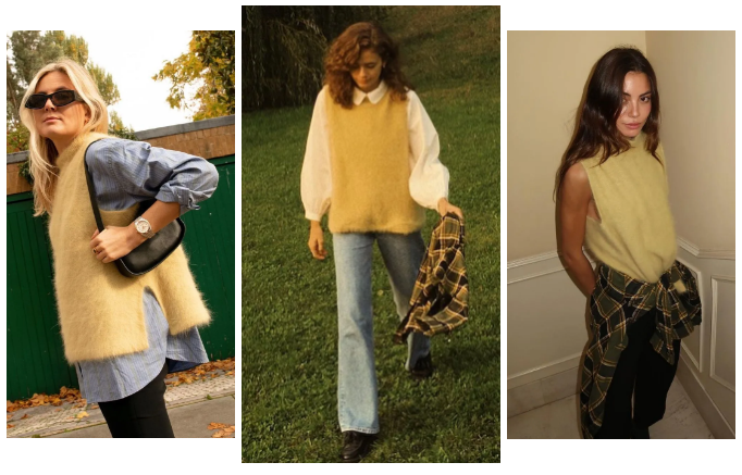 不喜欢这种基础色呢,换个明快的颜色也不错。英国博主Lucy Williams有一件小鸡黄的毛绒马甲,来自Bellerose。ins上穿的人挺多的,好显嫩!