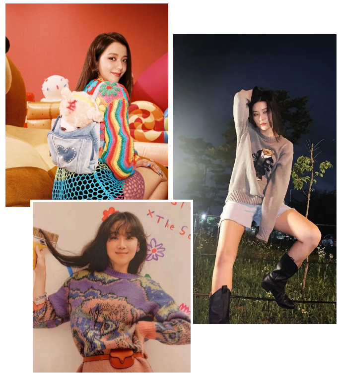 童趣毛衣在国外也有人穿。南韩那边,JISOO、孔孝真、姜涩琪都穿过。一个穿着拍MV,一个穿着拍画报,一个穿着去逛gai~~