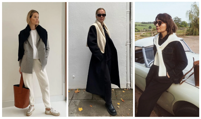 最后,别忘了我们这段时间一直在给大家强调的毛衣披肩大法,可比普通围巾有趣多了。更何况,基础黑白毛衣做披肩,本就最保险、最简单呀!