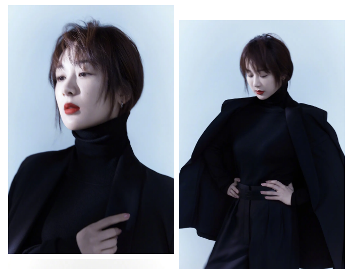再看国内呢,就刚前两天,杨紫妹妹也拍了一组大片,同是基础款黑色毛衣,搭配凌乱头发和复古红唇,超有氛围感!