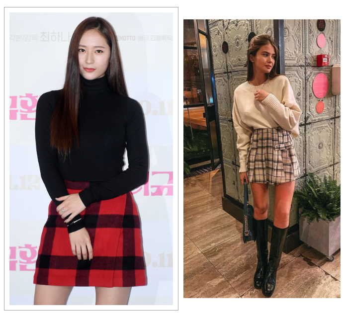 腿型好看、又不怕冷的妹子,还可以像郑秀晶和巴黎博主Anastasiia这样,搭条格纹短裙。红格纹青春,白格纹恬静,都蛮养眼的,很减龄。