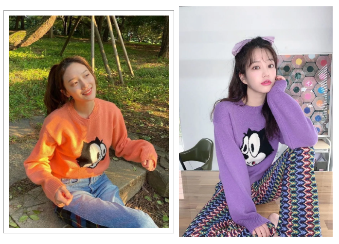 两个女演员表艺珍和李侑菲还撞衫过一件SJYP X FLEX的毛衣,同款不同色,都是少女: