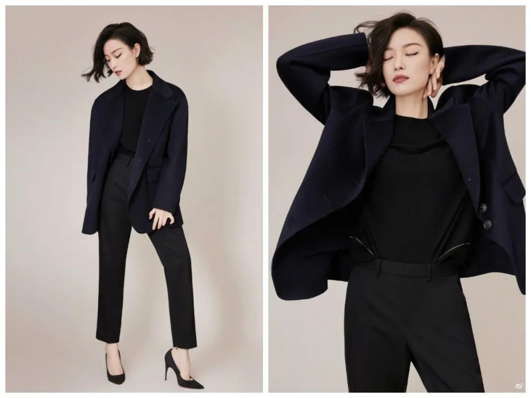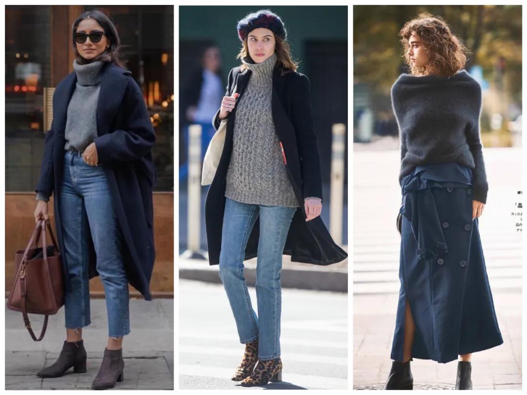 像钟小姐这样,深蓝色大衣+深灰色针织,浅蓝色牛仔就不错,满满的英伦学院风~