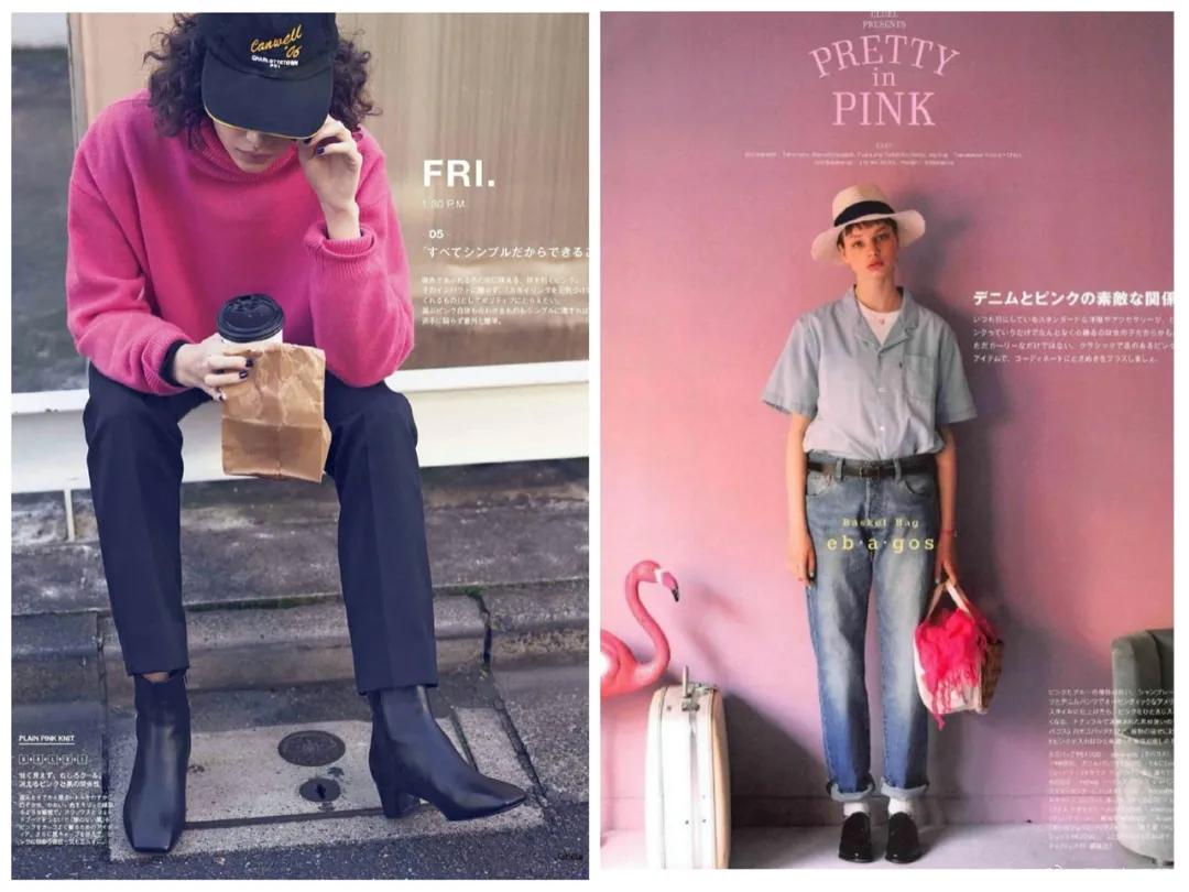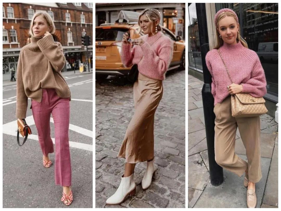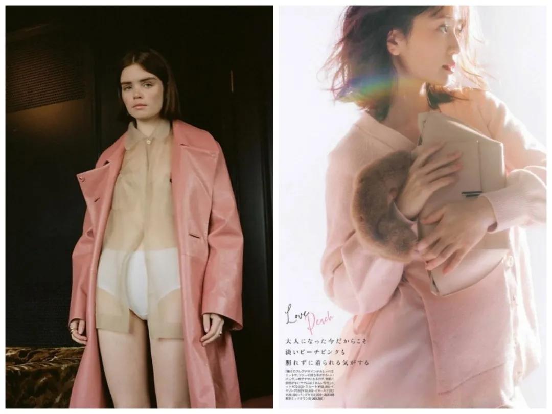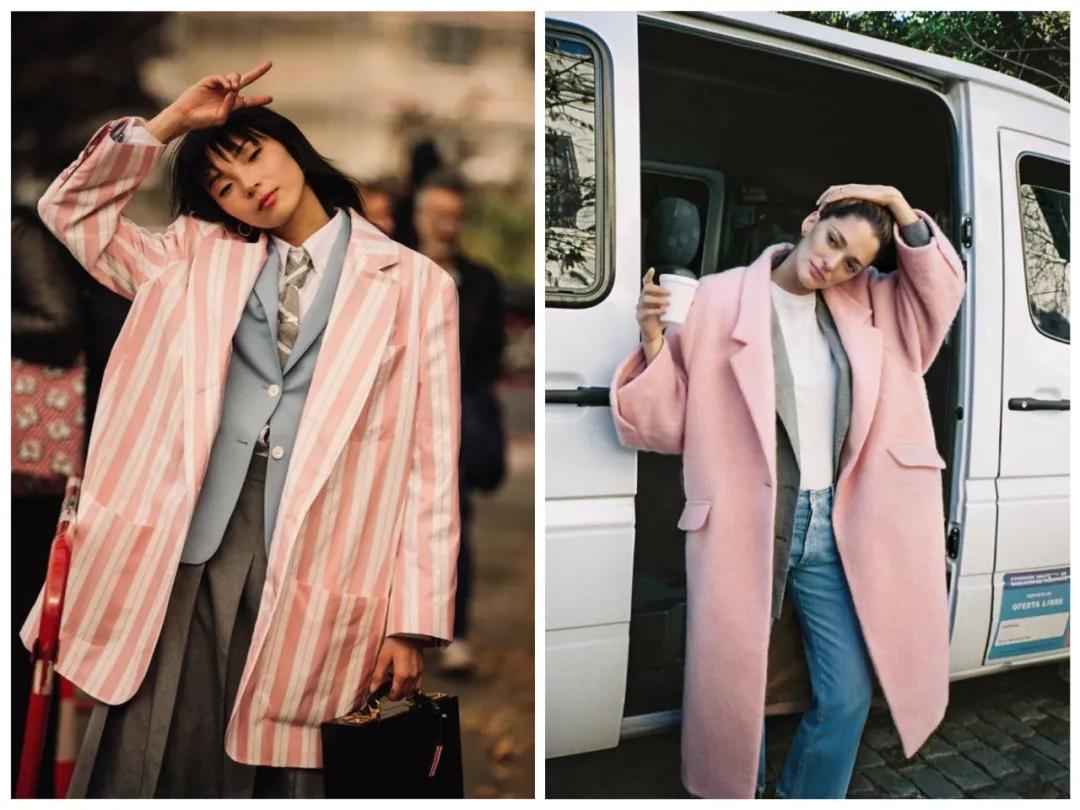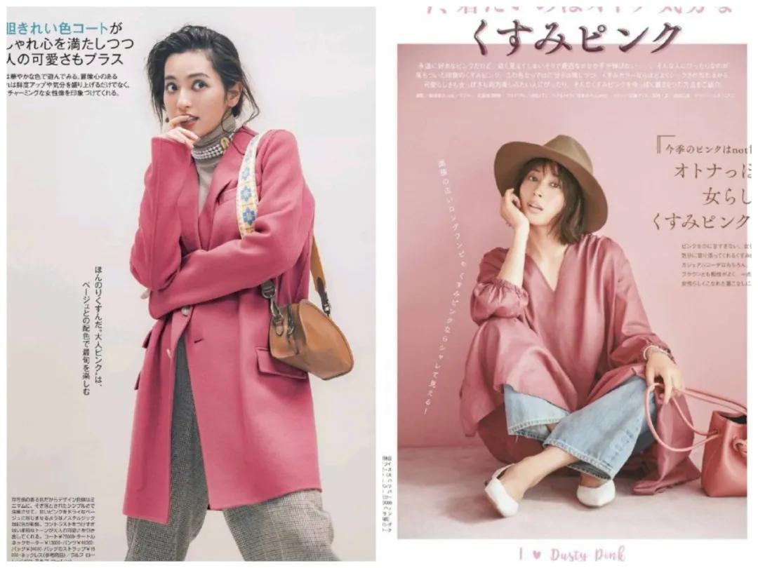 粉色中加入棕/灰色调,变成烟粉色或皮粉色,再搭配灰棕色或焦糖色单品即可,是不是很神奇?