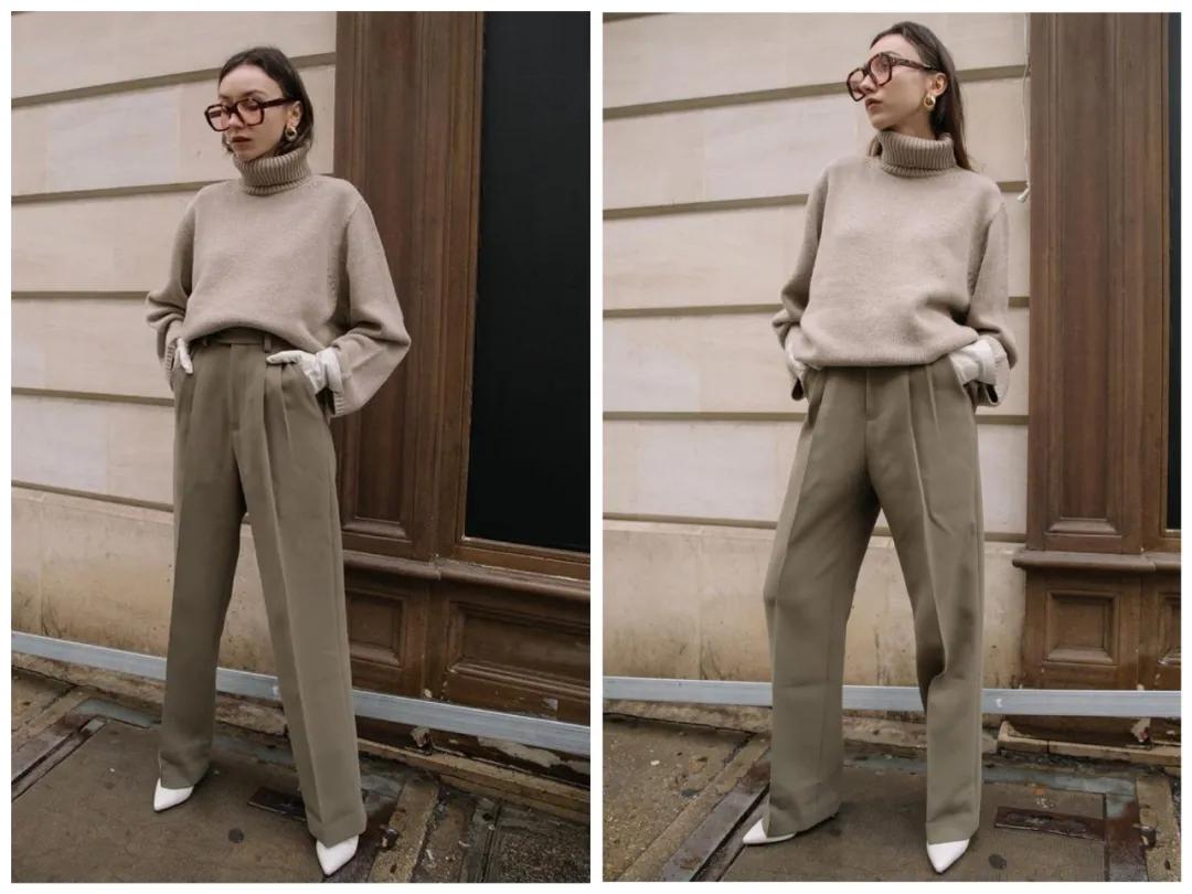 很会配这类颜色的Beatrice Gutu,用灰绿色长裤来配燕麦色毛衣,再以白色鞋子手套点缀,效果是不是也很?!