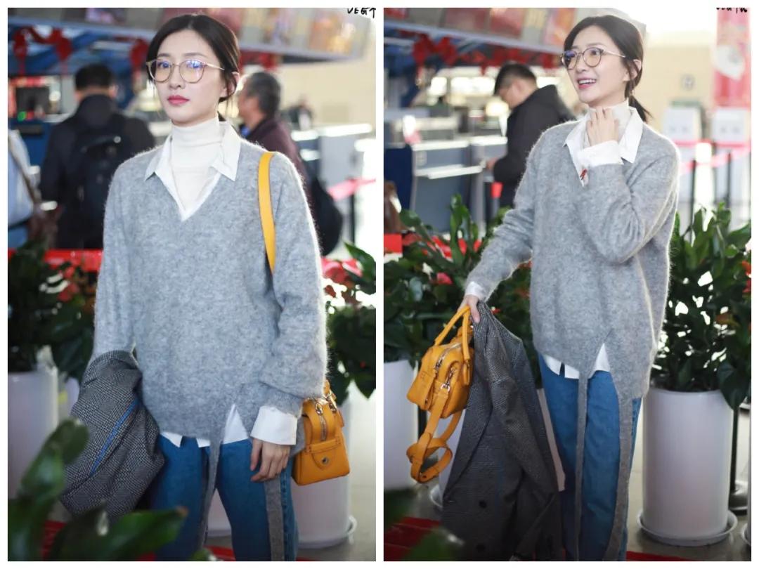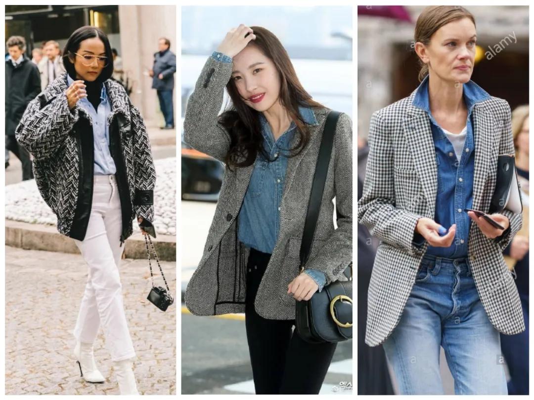之前Yoyo Cao和宣美就穿过灰色人字纹外套+牛仔衬衫,为原本简单的蓝灰配增添了一抹帅气。