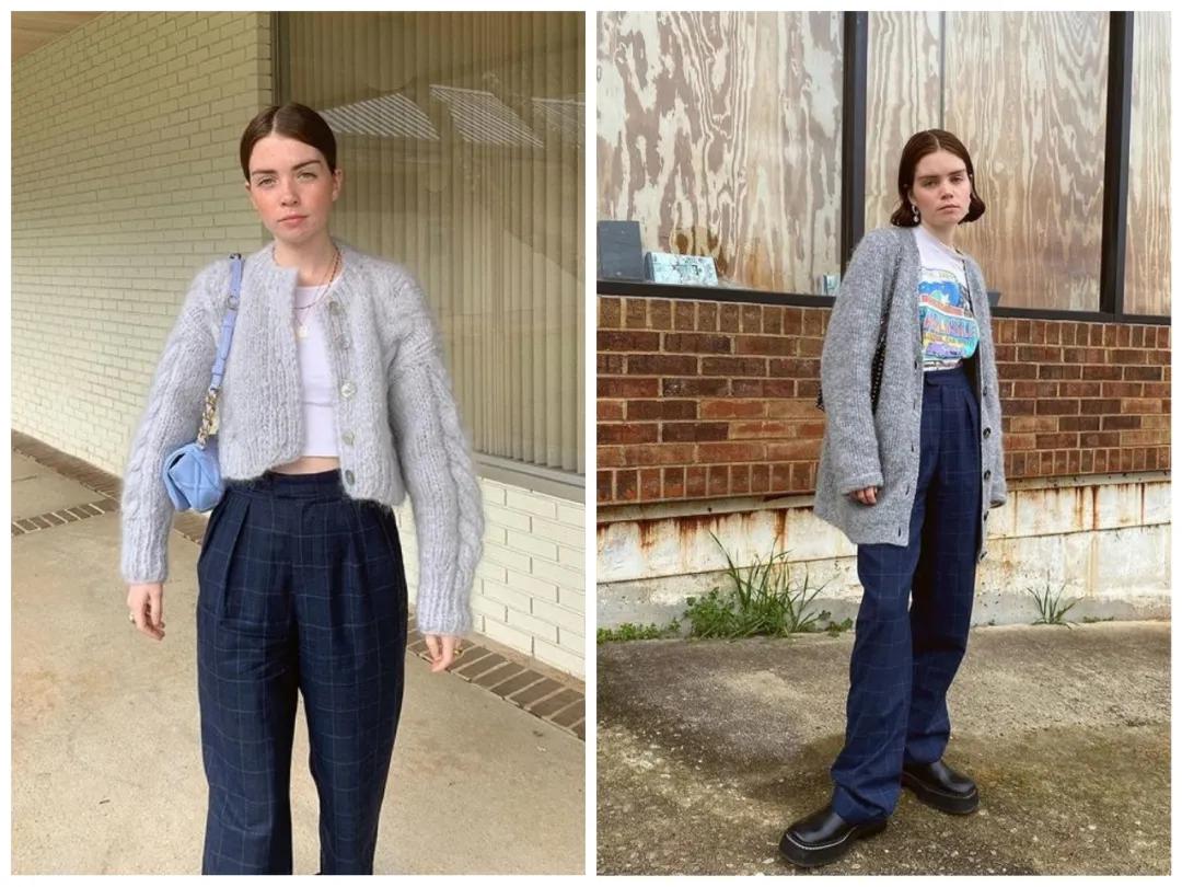 这个组合还可调个次序。像Reese这样,浅灰色的奶奶开衫+深蓝色裤装,视觉重点在上半身,对哈比人和梨形身材友好。