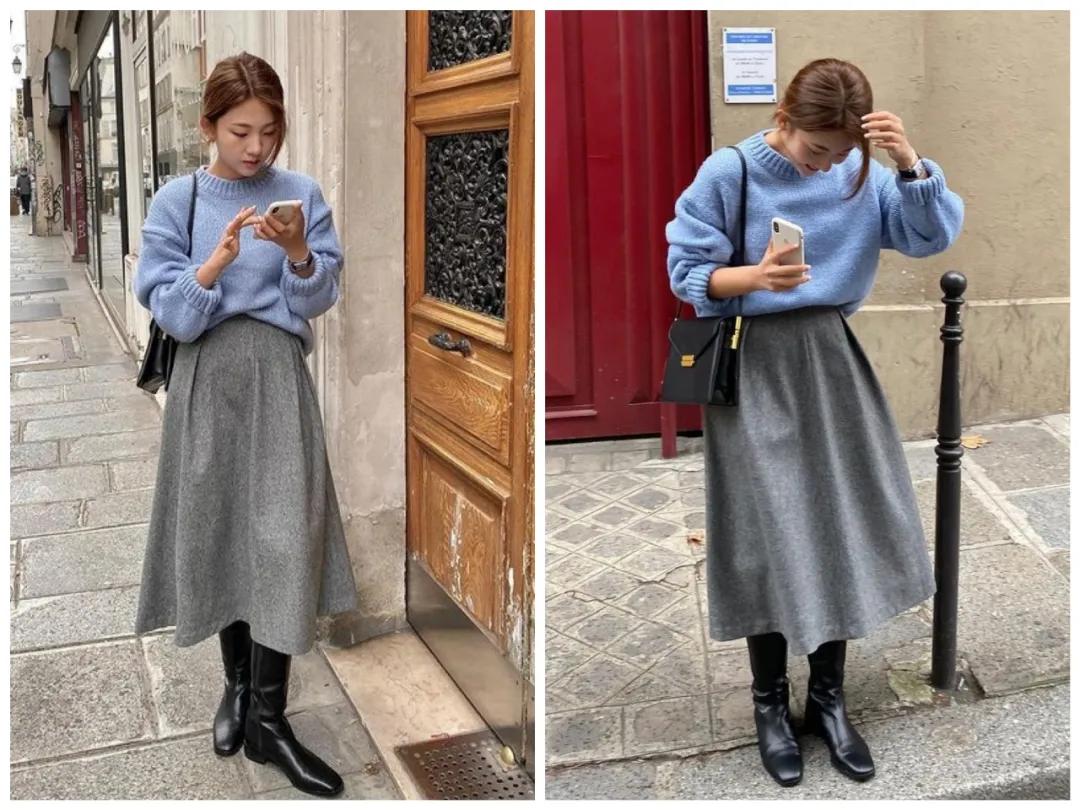 灰蓝色羊毛套裙,搭配一码黑内搭、墨镜、中筒靴,透露出高级知识分子的腔调~