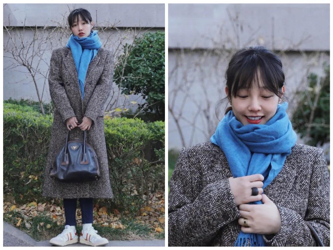 白百合私服里的杂灰色人字纹大衣,只需一条明亮蓝围巾就被点亮了~是我想穿的冬日look!