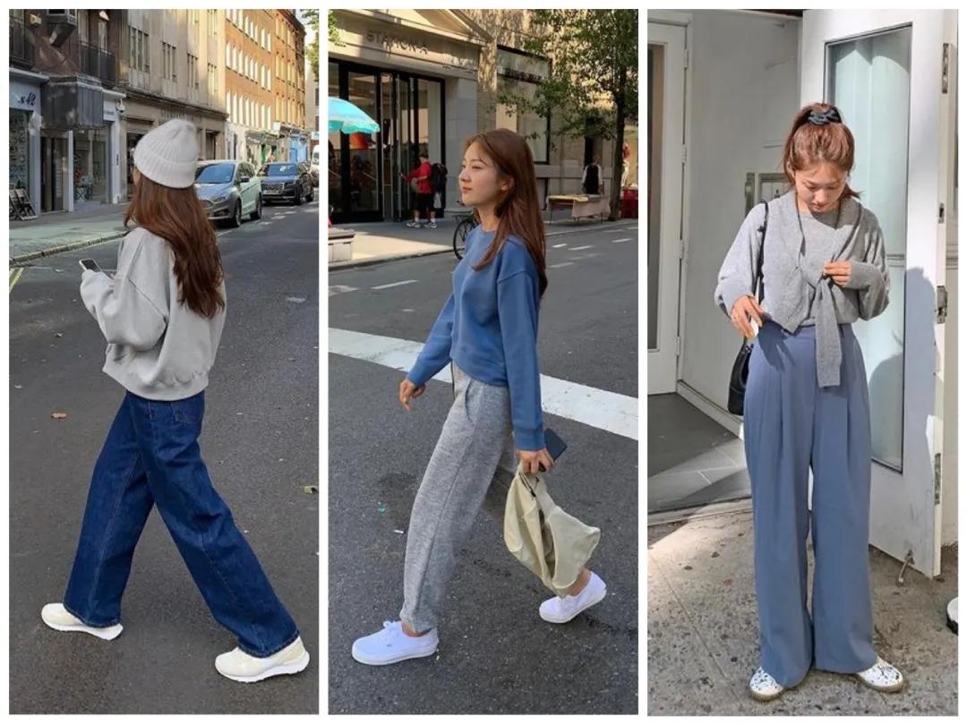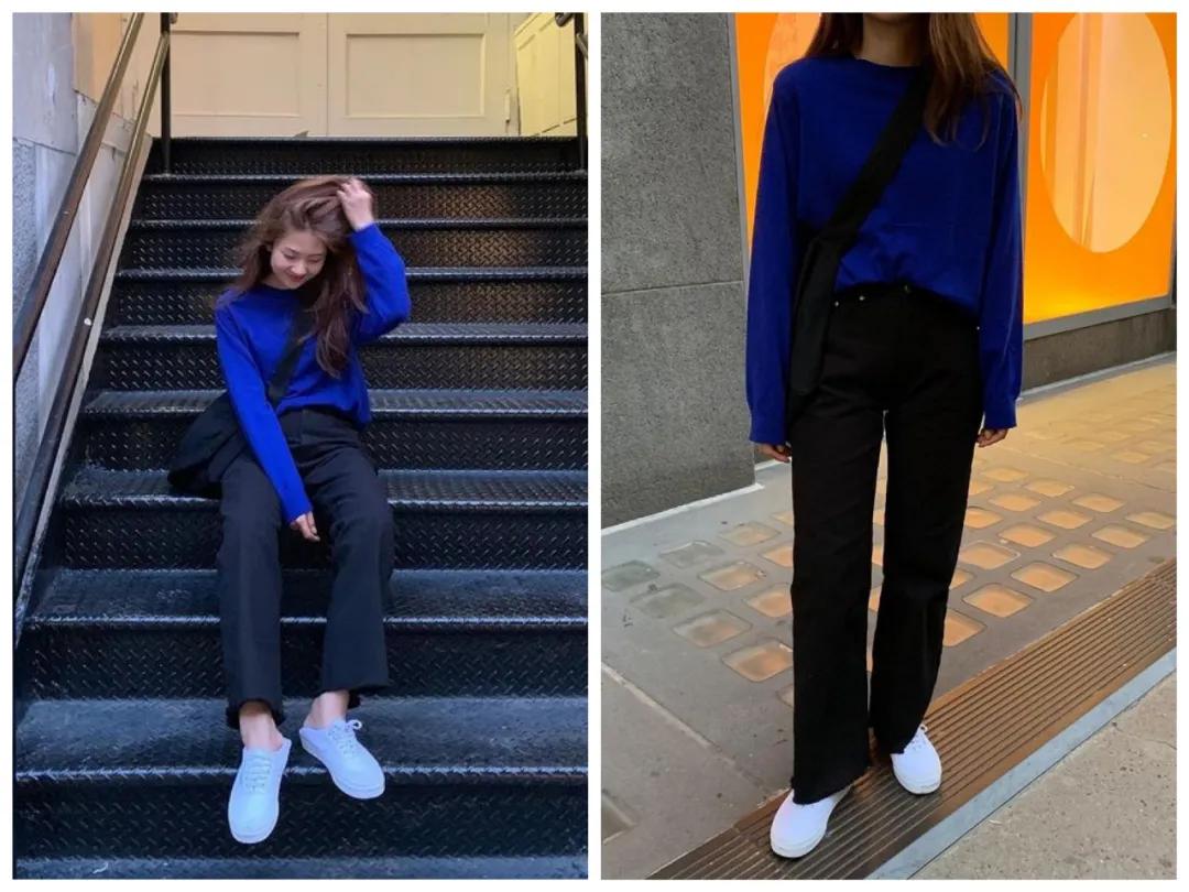 喜欢韩国博主Yuini这套,蓝毛衣+黑色宽腿裤+小白鞋,简单干练,穿去上班逛街都OK~