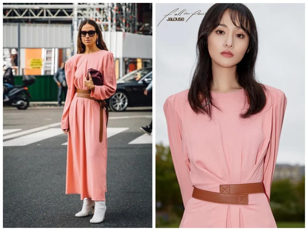 爽妹子穿的Stella Mccartney,大面积粉只需一根棕色腰带,就瞬间从全糖变成7分甜,甜得更高级。