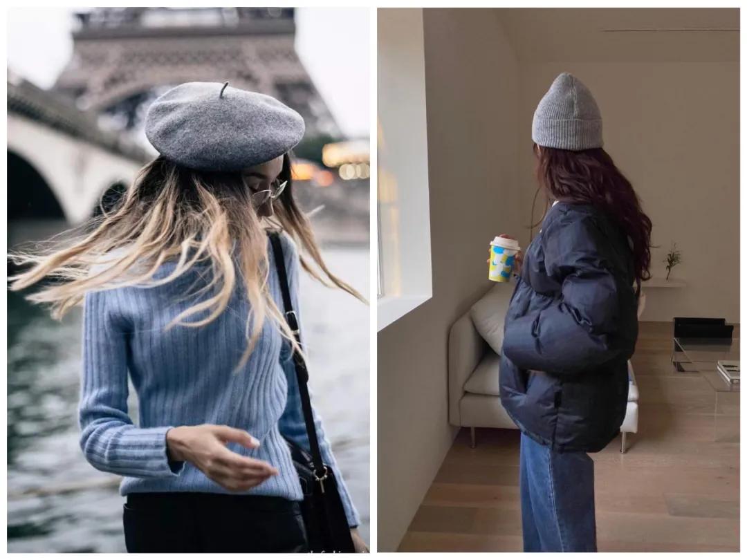 像这样,主色调为蓝色,加上一顶灰色帽子就很好看。