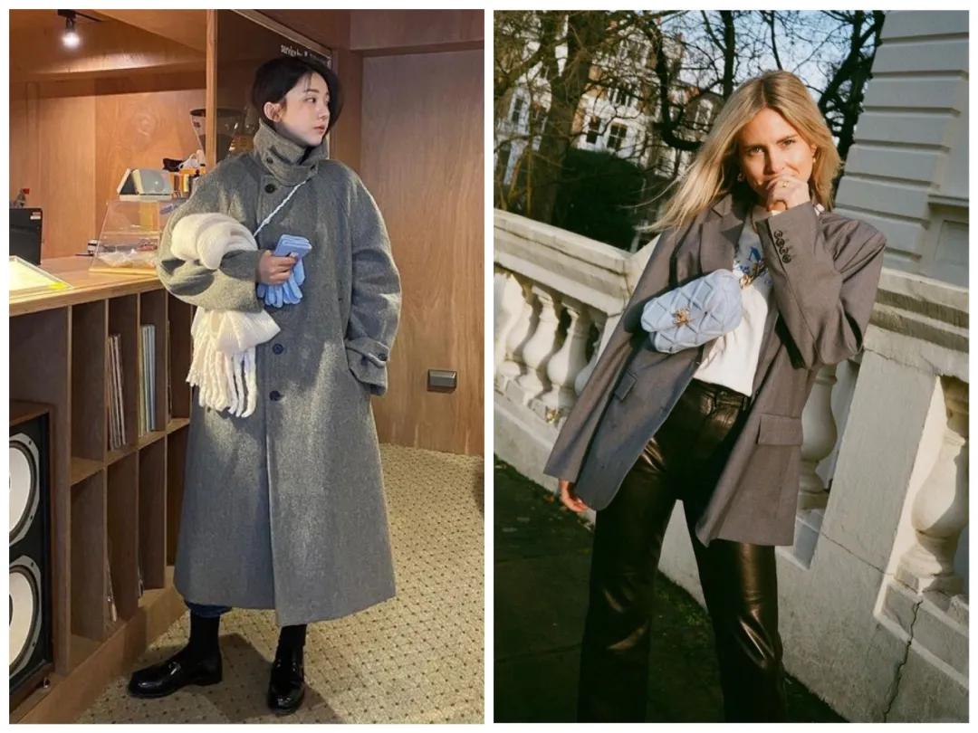 而当你穿灰色大衣或西装时,除了基础的黑白配件外,蓝色也是不错的选择~