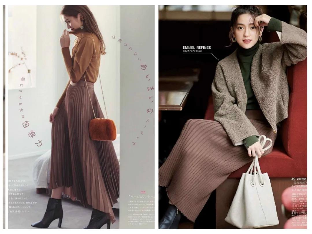巧克力色毛衣搭配深粉色下装,以白色衣角提亮,真真暖到心尖尖~约会或年末见家长穿,一定能留下好印象。