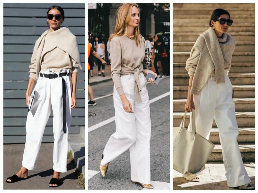 对于梨形妹子,把白色放下半身考验勇气和选品。不妨调个顺序,选择不膨胀的燕麦色下装。搭白衬衫,白毛衣,白大衣都行。