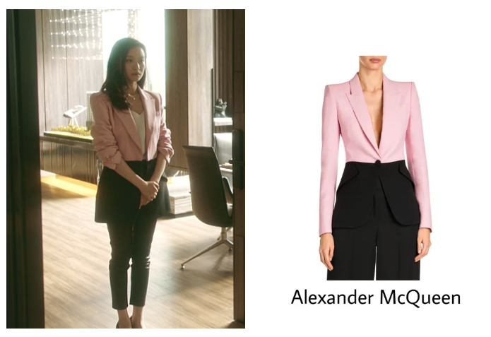 粉色西装她还穿过一件粉+黑的拼接款,来自Alexander McQueen,搭了黑色铅笔裤,特别帅气。
