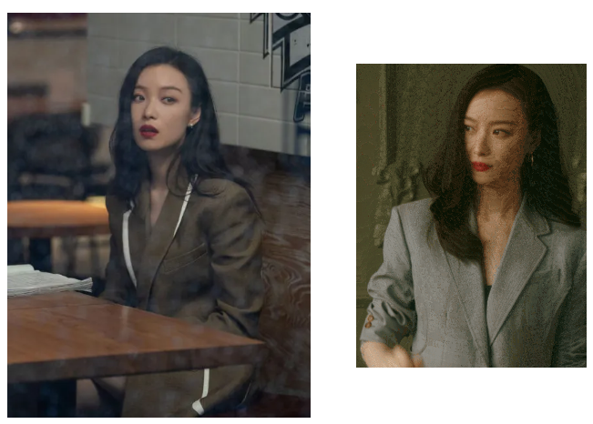 同样是容易显老气的深咖色、灰色西装,朱锁锁也在选品上花了心思。