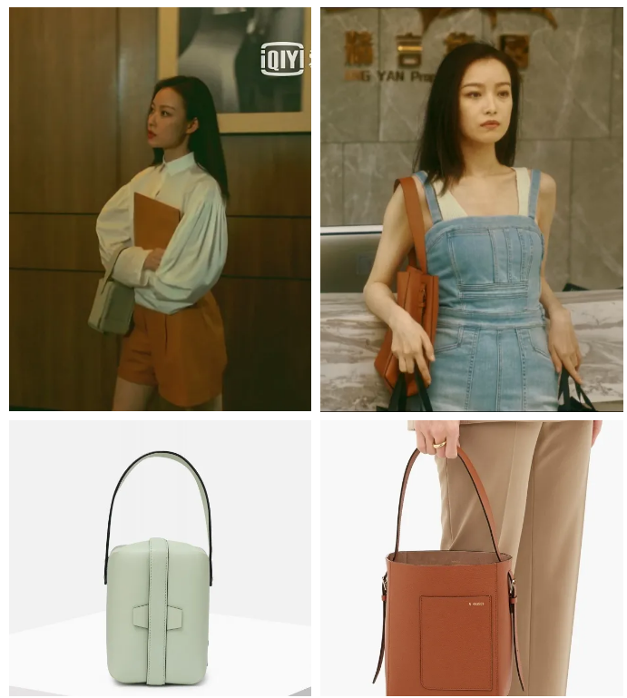 比较有造型感的还有两只水桶包,都来自意大利品牌Valextra。薄荷绿那只是Tric Trac,她用来搭棕色皮裤撞色。棕色那只是Bucket,配牛仔特别好看: