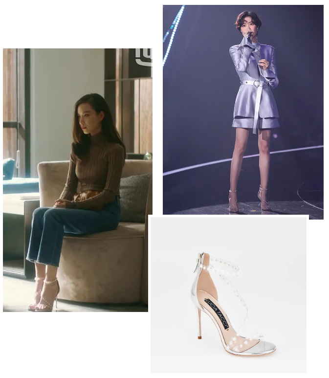 让我印象深刻的还有回她被King Kong请去公司,穿了双细高跟凉鞋。上面缠绕着小珍珠,超精致!这双来自Lucia