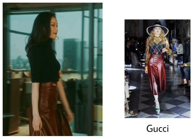 下半身她搭了条Joseph的棕色皮裙,蓝+棕的配色好高级,一下质感就上来了。这一身也适合绝大多数职场女生copy。