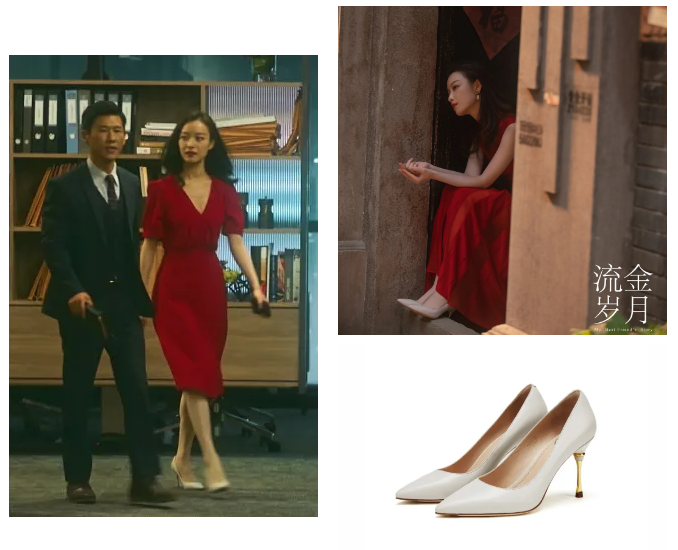 剧中她穿了好多国内的品牌,其中翻牌最多的是73 Hours,两次经典红裙look都pick了他们家的Roll the dice白色高跟鞋。一抹金色鞋跟,精致极了。