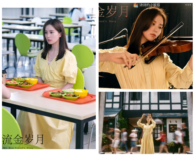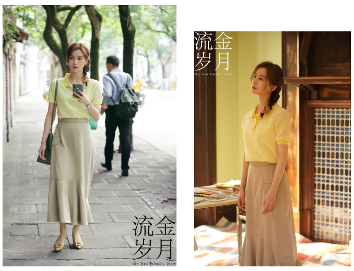 而剧中除了白色,南孙身上出现最多的就是嫩嫩的淡黄色。比如美上热搜的这套黄+卡其,polo衫的贵族气质和鱼尾裙的精致优雅,都很符合富家女的设定。