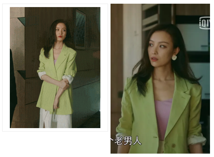 她还有件嫩绿色的Jacquemus西装我也很喜欢,搭了条白色斜开衩的裙子,好清爽!特别的是,她搭了个浅粉色小吊带,这一抹小撞色不显眼,却很特别。