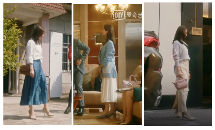 但开始工作后,她就换成了更利落的直筒裙,或是更成熟、更女人味的垂感迷笛裙。