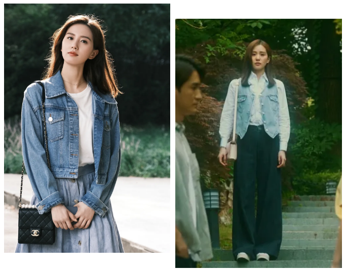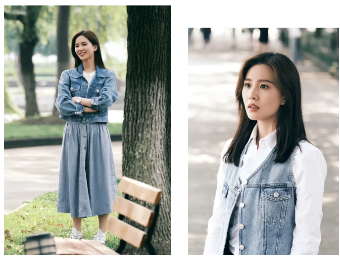 在校园里她会穿牛仔外套+迷笛裙,或是牛仔马甲+白衬衫,很是青春。
