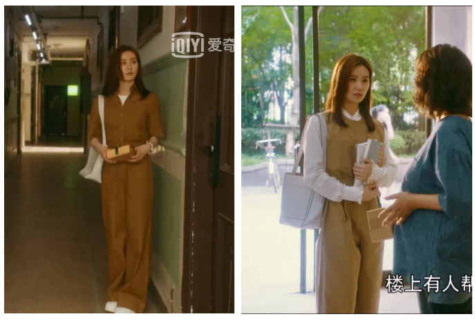 她还穿过两条卡其色的连体裤,也都是白色内搭: