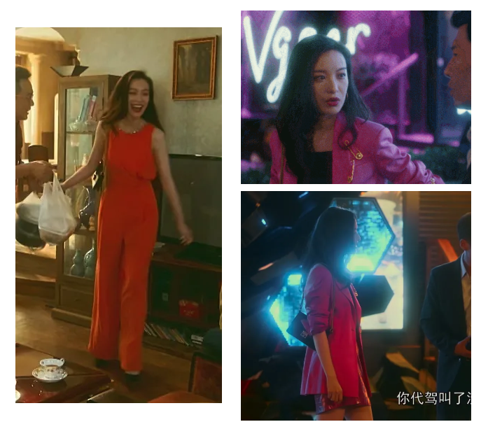 包括各种接近色,也是写着朱锁锁的名字。比如参加庆功宴,她会穿橘红色的连体裤;配客户唱K,她就穿艳丽的玫红色西装配紫色皮裙。整个人艳丽极了。