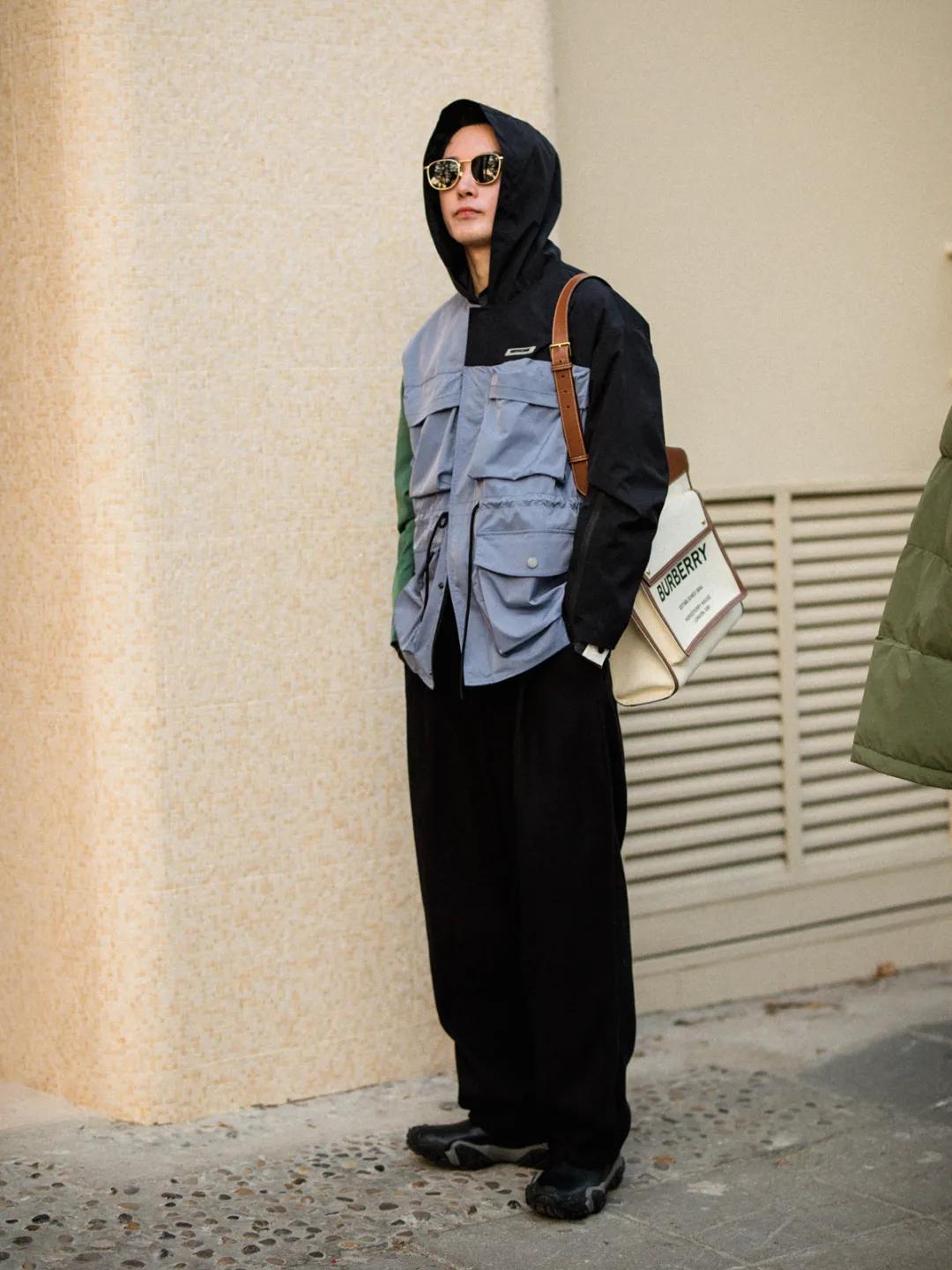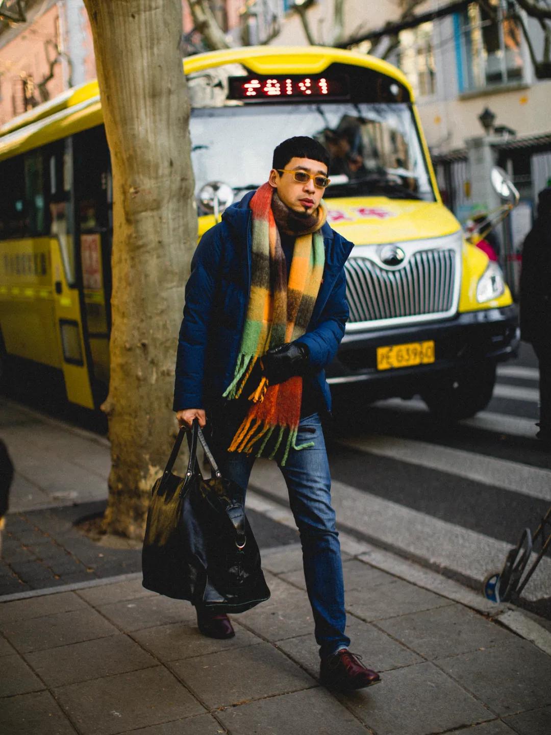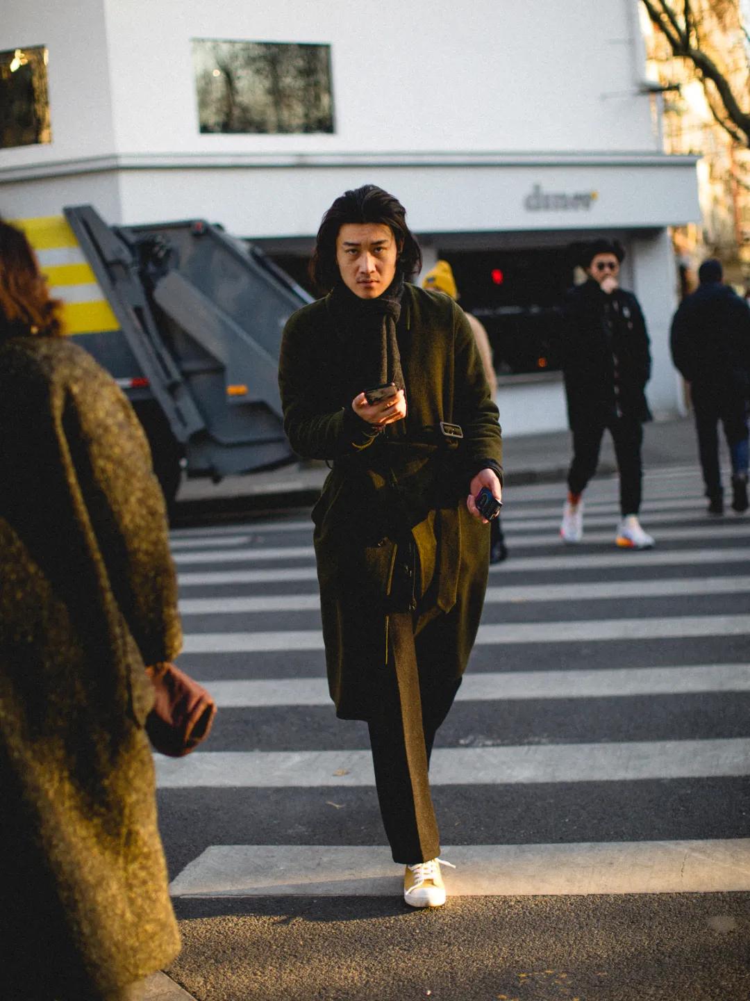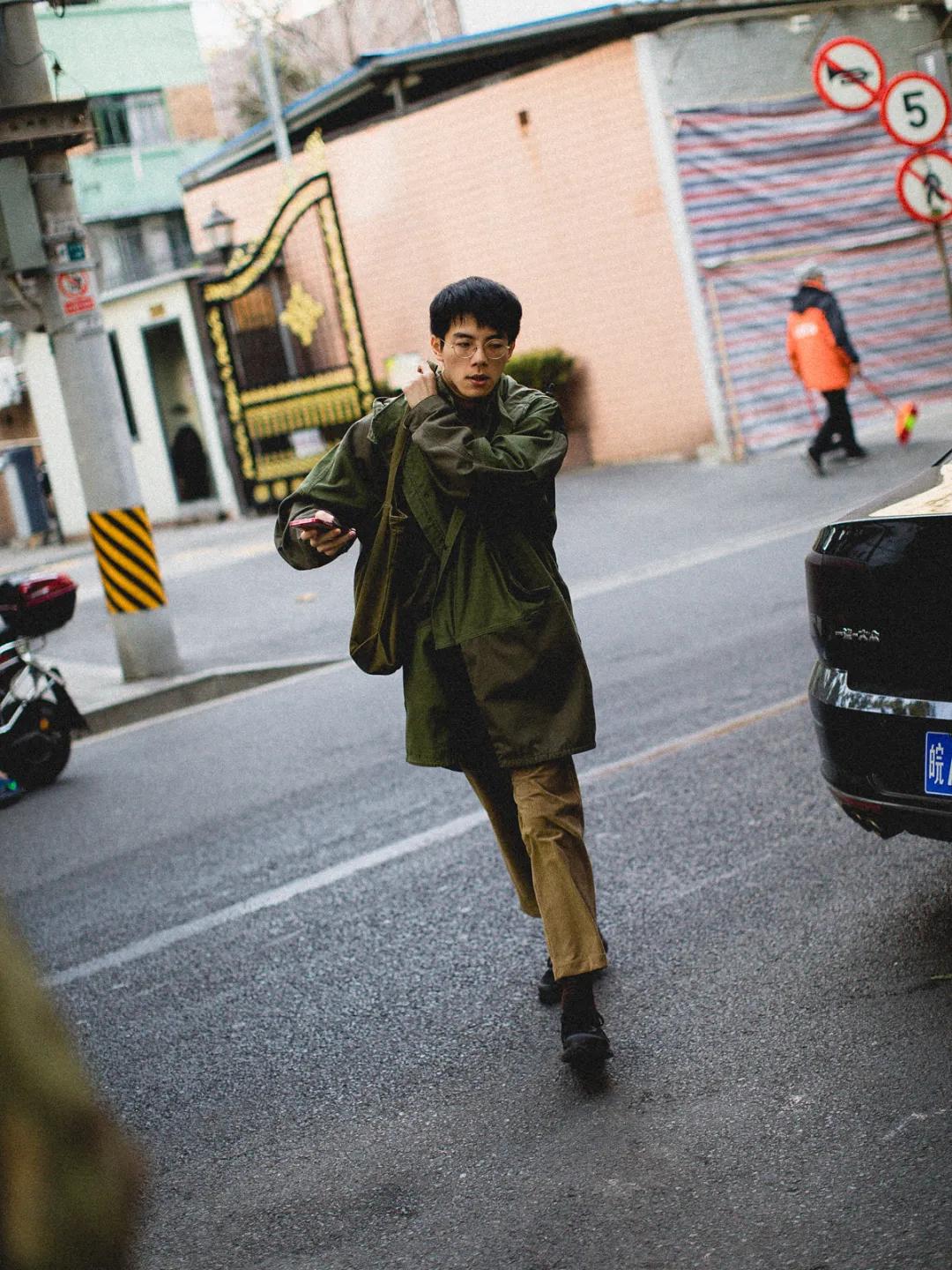 近期最喜欢的抓拍之一。绿色+卡其色,男生冬日标配。