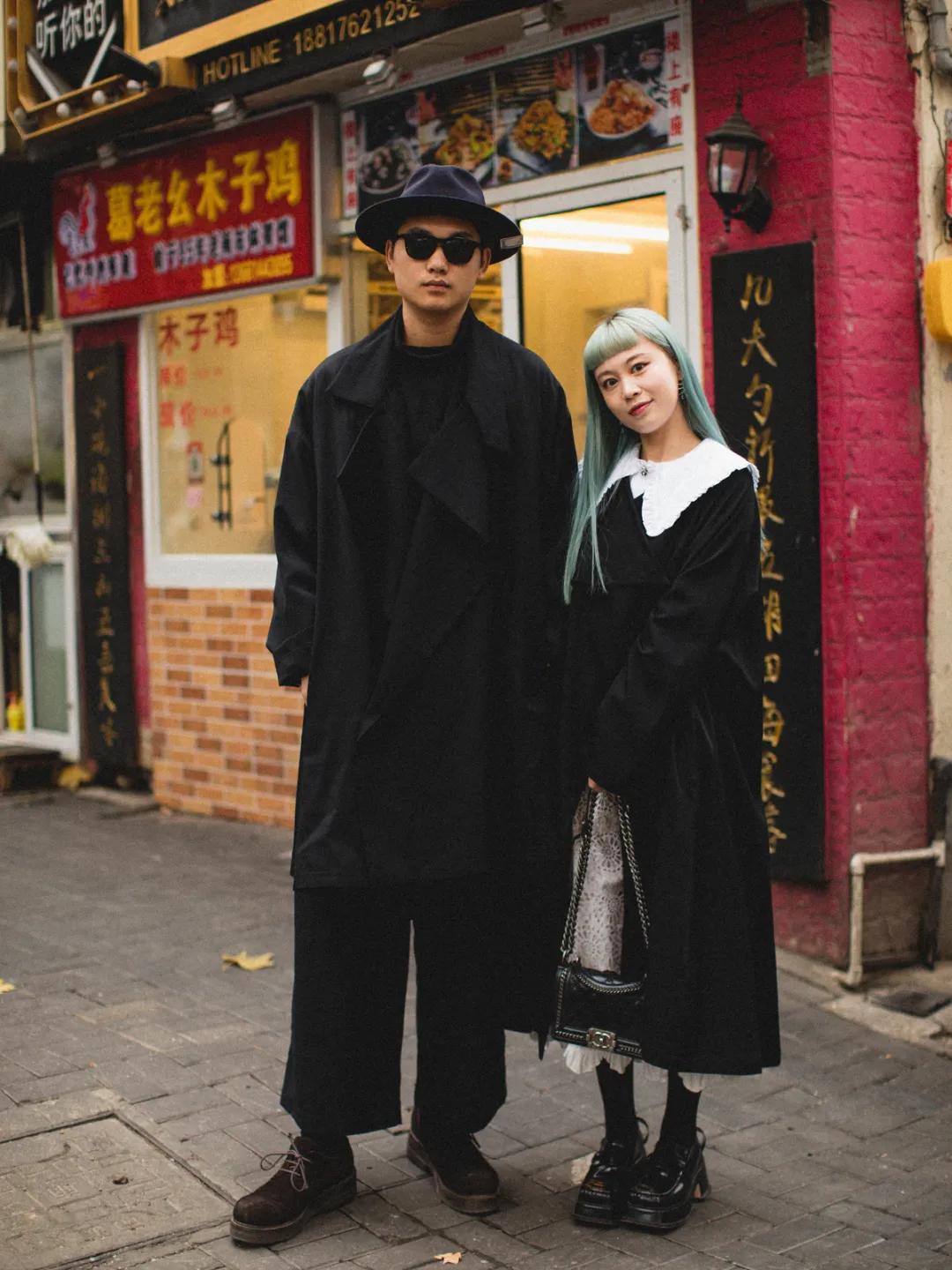 这边有很多接地气的饭馆。烟火气里的黑色情侣装,一个甜一个酷。