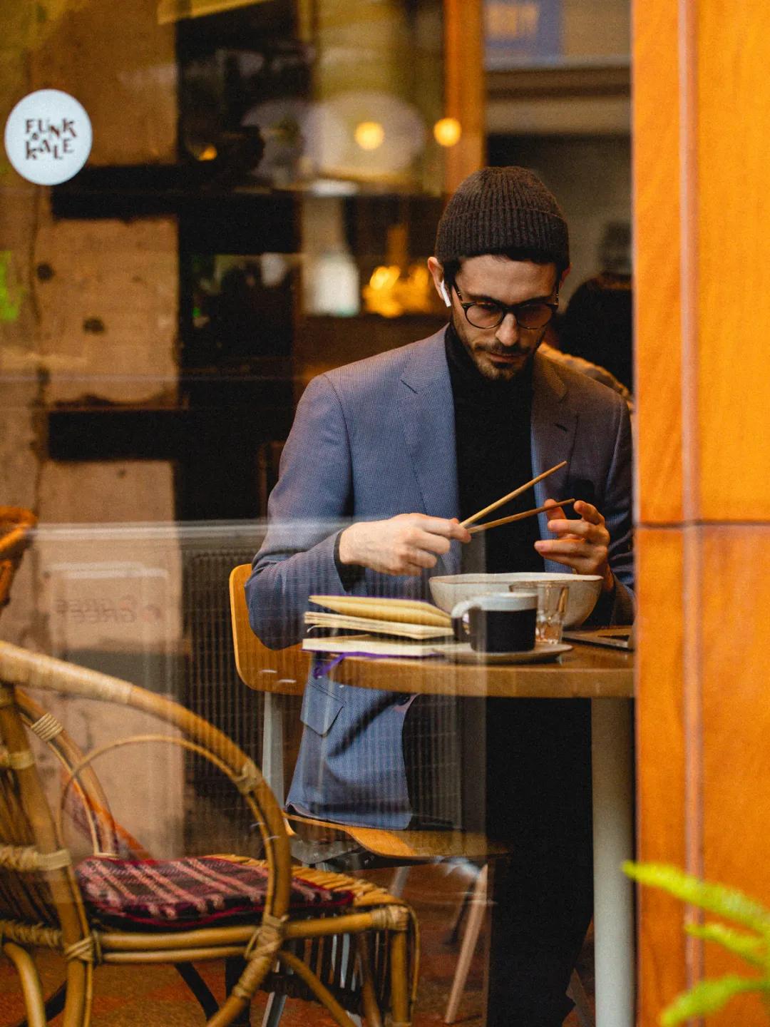 太喜欢他的穿搭了,进门之前已经被我的镜头锁住,但是拍别人吃饭不太好,郑重给他道个歉。