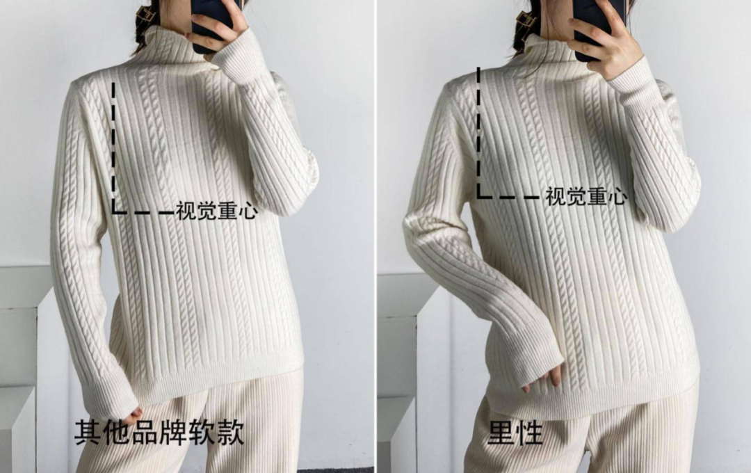 不会过高,显臃肿;也不会完全无支撑,看起来下垂。得益于罩杯中间“倒人字”设计,有微微挺拔的效果,自然不突兀。很推荐大胸选它做高领衫内搭。
