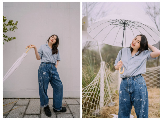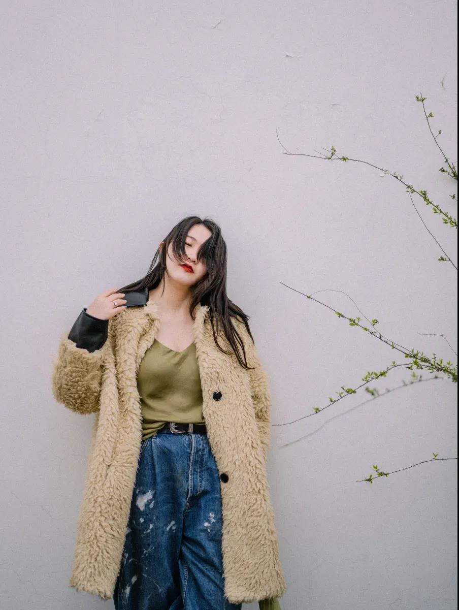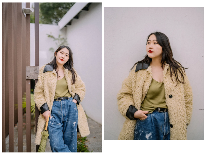 拍这组的时候,因为下雨还有些凉,所以我搭配了暖和的毛茸茸外套。我觉得这间在春/秋/冬天搭配开衫、西装、衬衫都行,做内搭非常棒了!