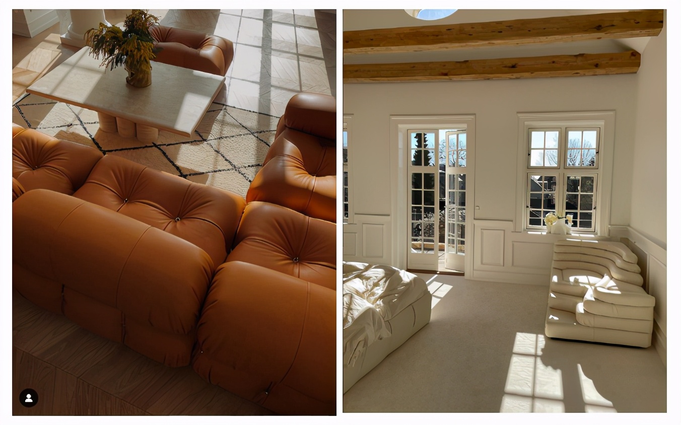 她定的Mario Bellini沙发(左),等待了一整年时间,终于到货了。立刻布置完之后,她还分享了自己的卧室~要知道,她之前分享了很多床,可都是不同“酒店”里的。