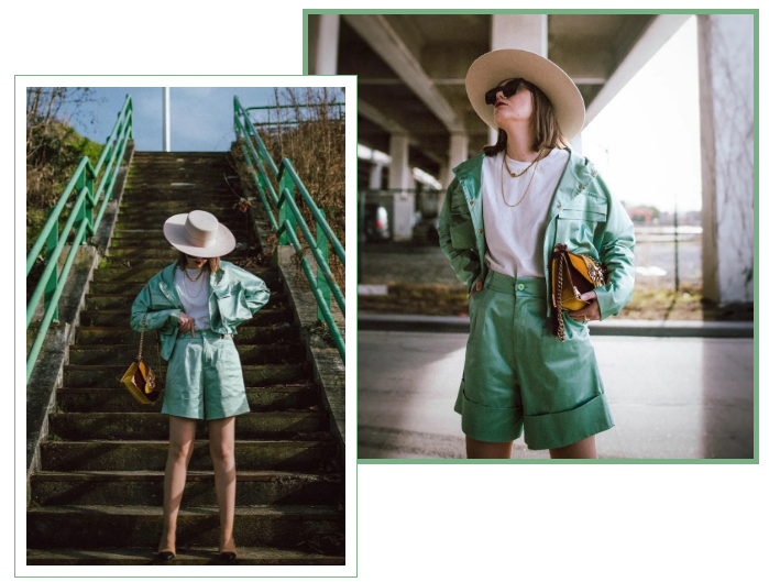 像这样休闲的短款套装,比利时博主Andreea Birsan最近也穿了一套,薄荷绿的工装风短裤套装,帅气又干练,我好喜欢!
