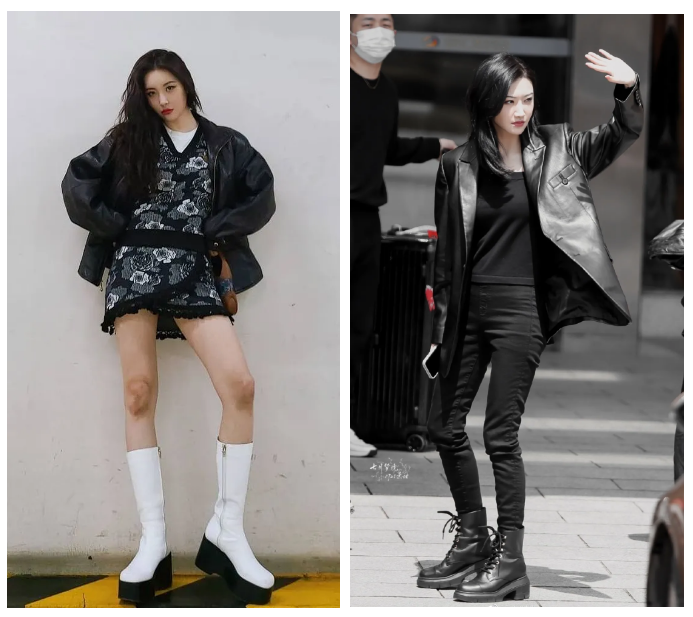 还有穿皮衣的酷酷女生。宣美一如既往的腿精,出乎意料的是一向甜美富贵花的景甜竟然也如此帅气,皮西装穿出大佬既视感!