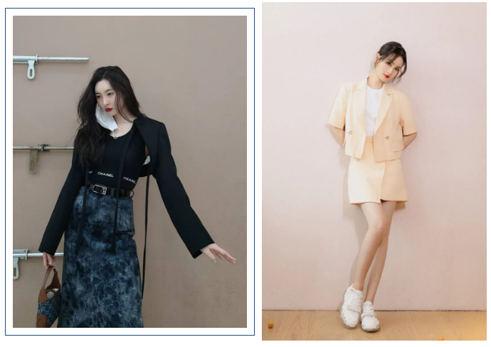 我发现这段时间穿短西装的人好多。这是宣美和李沁,李沁的短西装是还算常规的腰下位置,宣美的西装短到只护住咯吱窝~