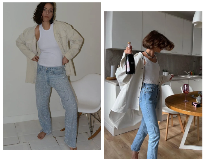 意大利博主Erika Boldrin和俄罗斯设计师Polina都是白色大衬衫+背心+牛仔裤的思路,很好copy: