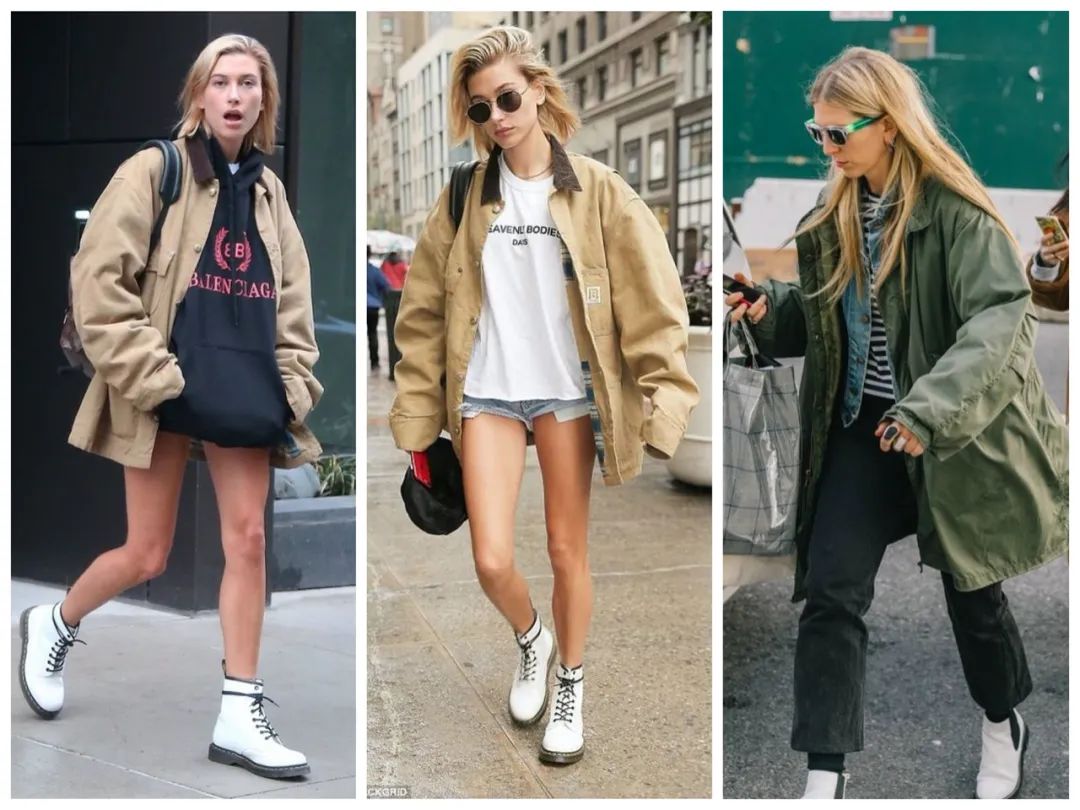 机智如海狸,还会利用小白鞋做小面积提亮。白色马丁靴+户外夹克,露出美腿,性感中不乏帅气~