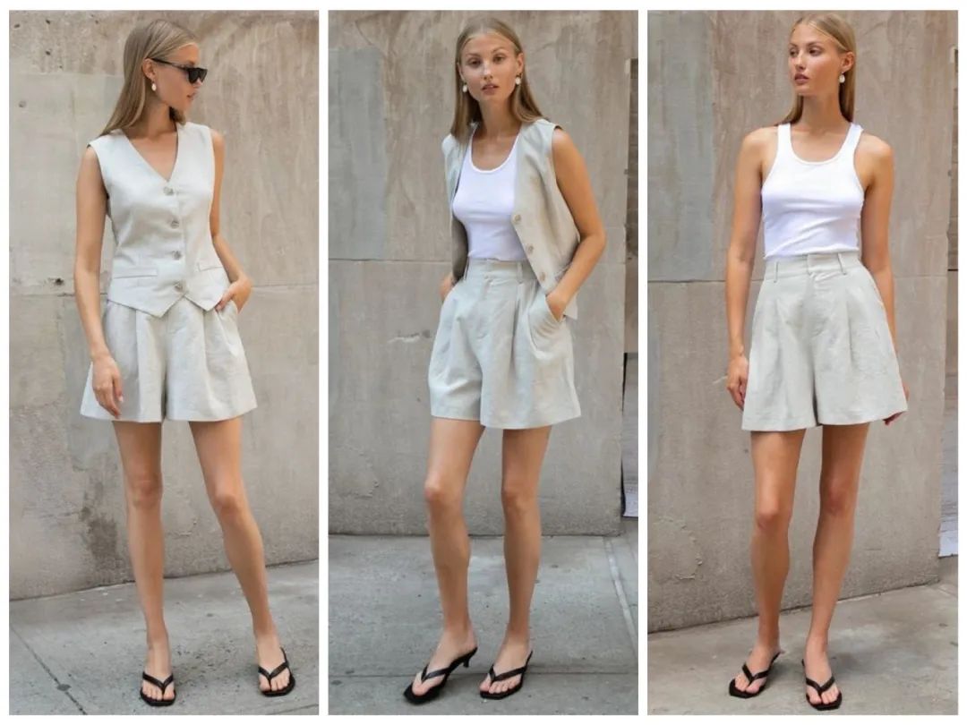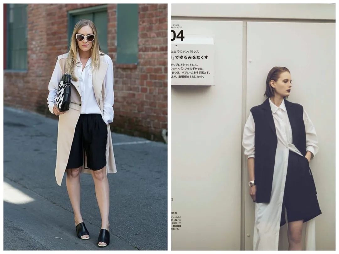 相比短马甲,长马甲的职场氛围感更浓,且五分短裤的休闲感刚好中和其严肃感。内搭一件白衬衫,错落有致,层次丰富。