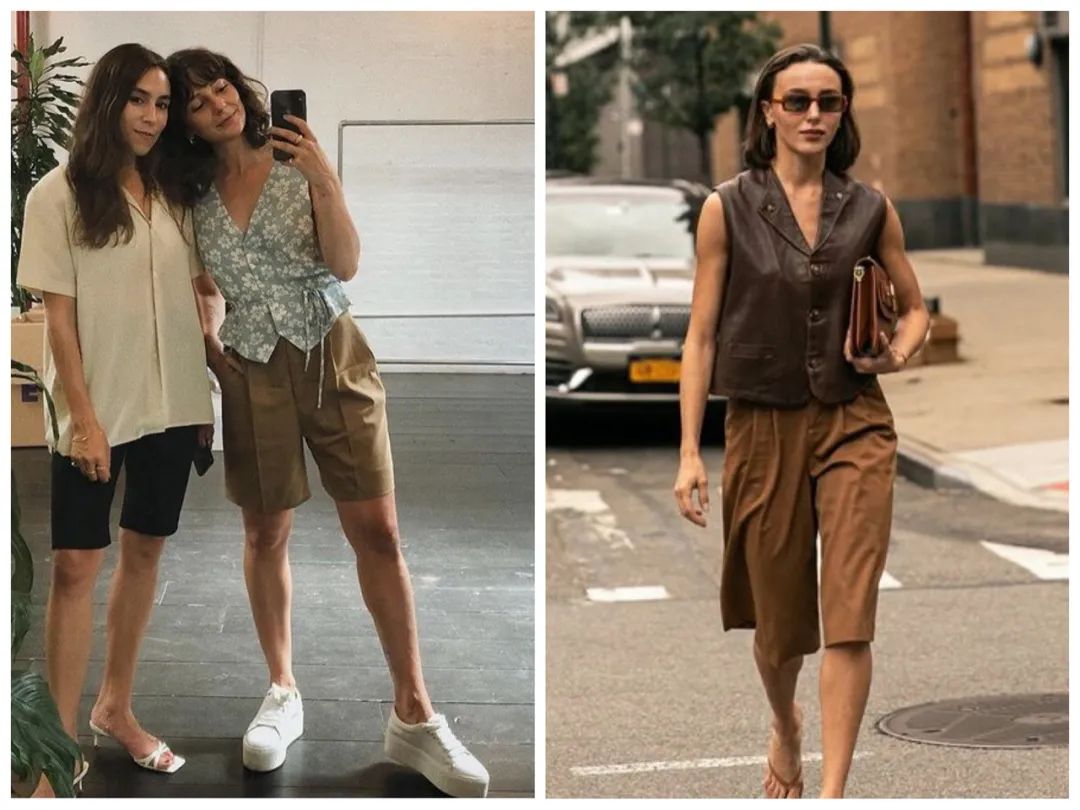 时装精Chloe和Grece Ghanem则抓住了时髦重点:垫肩T恤+五分短裤!