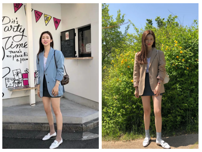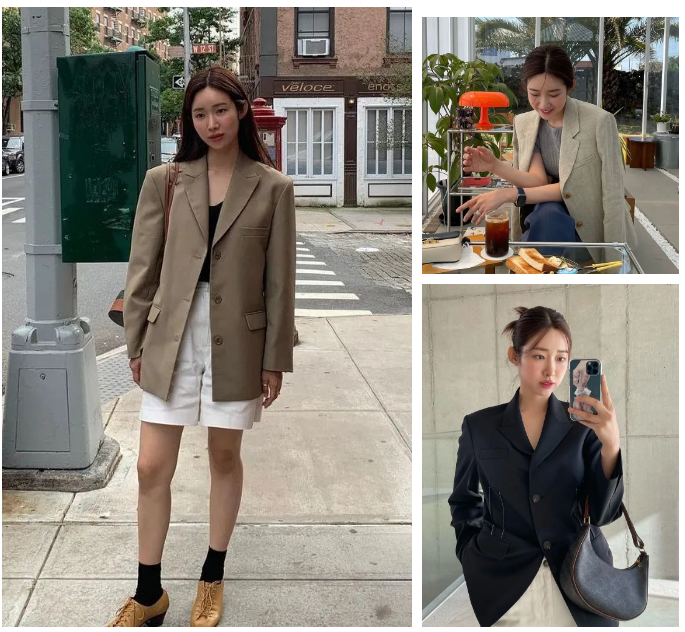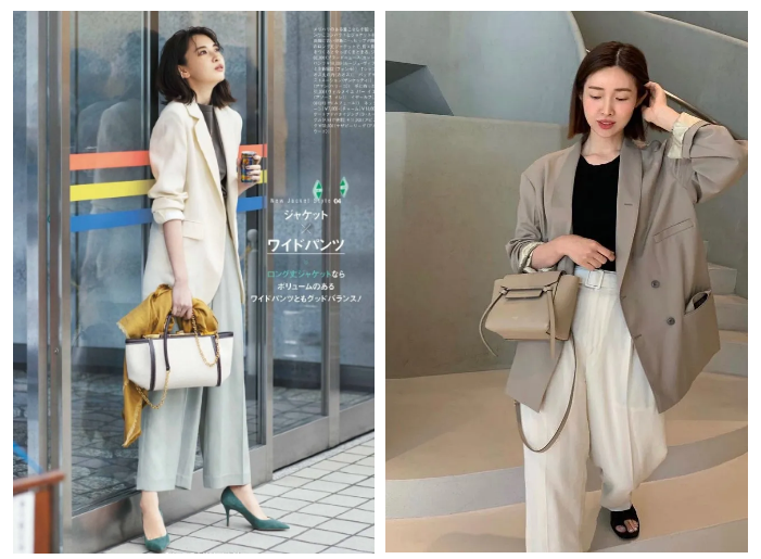 日本女生偏爱直身、略宽松的西装,来体现轻熟的职业感(左);而韩国女生明显更喜欢欧美风的大宽肩廓形西装(右):